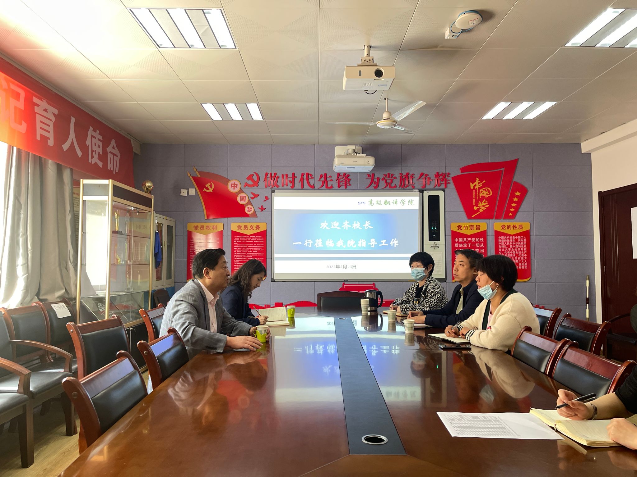 4月20日西安翻译学院副校长齐玉水、教务处长秦晓梅分别对我校英文学院、国际商学院和高级翻译学院三个国家一流专业建设情况进行调研。