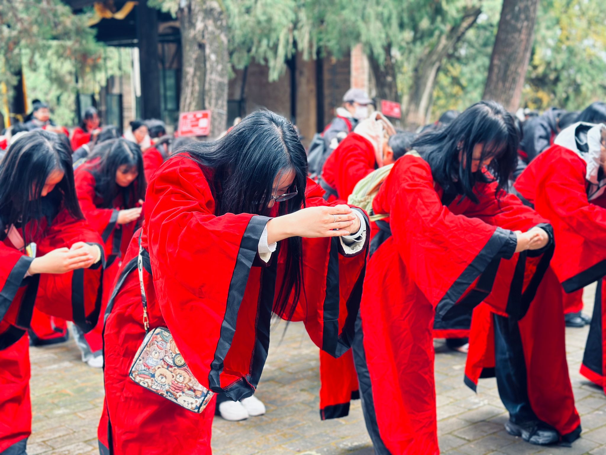 参加祭祀活动的老师、学生们身着传统服饰,怀敬舒诚,仪门行礼,恭敬入城。参祭人员沿中轴大道步入神道,拾级而上进入仓颉庙前祭祀广场,全体肃立,正衣冠、洗尘蒙、静心智,行三礼。此次祭祀典礼沿用省级非物质文化遗产“谷雨祭祀仓圣典礼”九规制礼祭拜。在此祭祀大典中,学生们深入学习,亲身体验敬香、献五谷、敬献花篮、上贡酒、恭诵祭文等仪式。