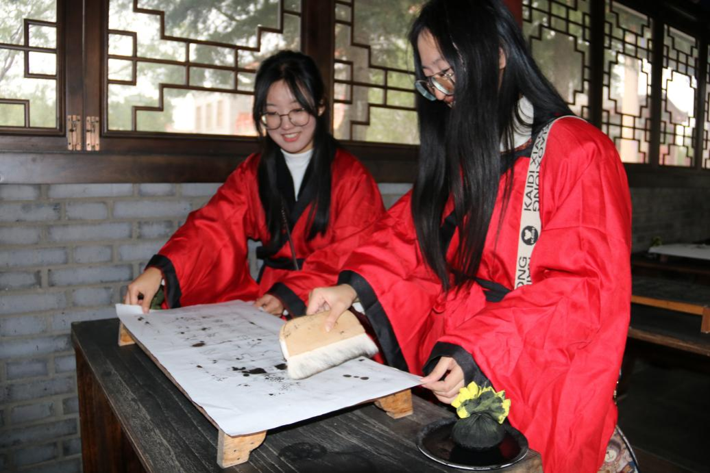 讲解员带领学生们来到书坊门前,引导学生集体诵读《仓颉颂》,以示对仓颉的怀念与对汉字文化的崇敬。体验雕版印刷时,学生们在刷墨、覆纸、拓印的过程中,仿若穿越时空回到古时书坊,感受文字与纸张的奇妙融合,更加了解到古代印刷术的精湛,更激发了他们对传统文化的热爱与传承之心。为了使此次活动更具实践意义,老师们还组织了现场教学活动。学生们以小组为单位,针对仓颉庙内的某一处文化元素进行深入研究和讲解。通过这种方式,同学们不仅加深了对所学知识的理解,更锻炼了自己的实践能力和团队协作精神。
