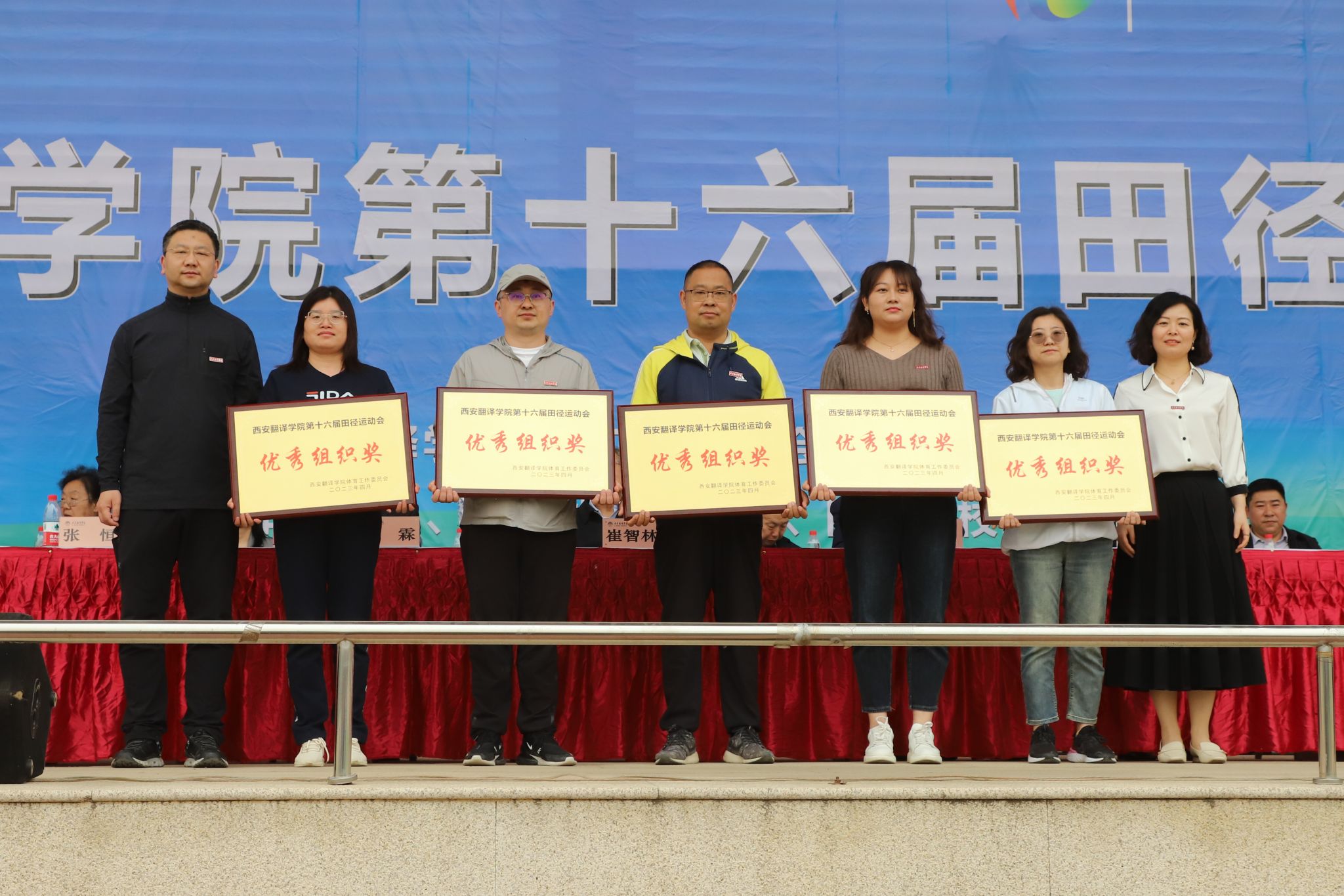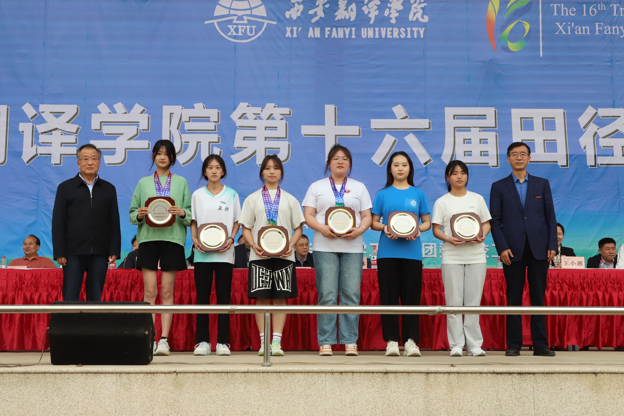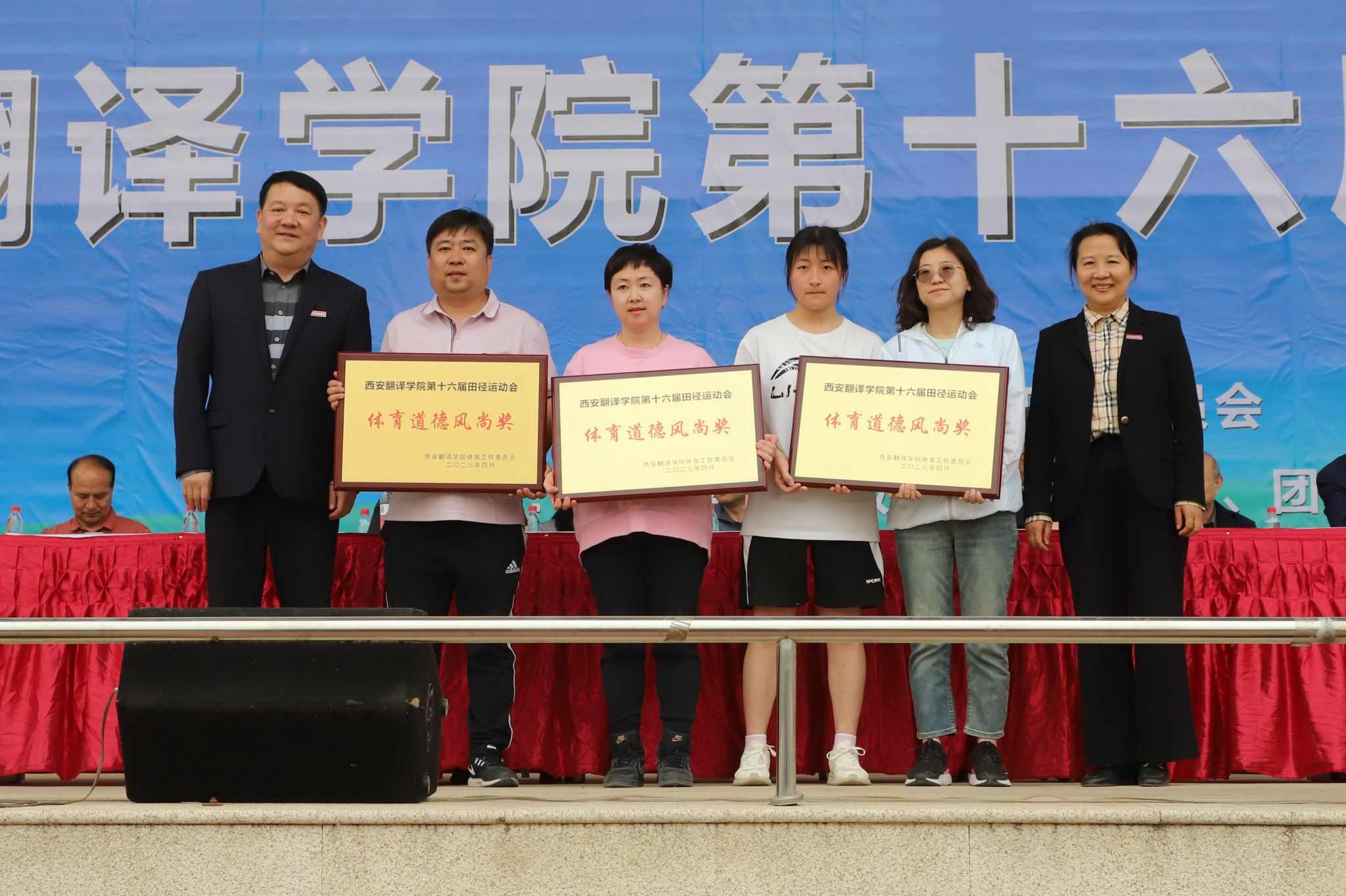 王小惠宣布运动会获奖名单。英文学院、国际商学院、教育学院获得体育道德风尚奖;校工会、学工部、教务处、信息工程学院、国际商学院、团委获得优秀组织奖;高级翻译学院、亚欧语言文化学院、艺术设计学院、护理与康复学院、文学与传媒学院获得精神文明奖;后勤集团、体育学院获得特殊贡献奖。我校领导为获奖运动员及团体颁奖,并合影留念。