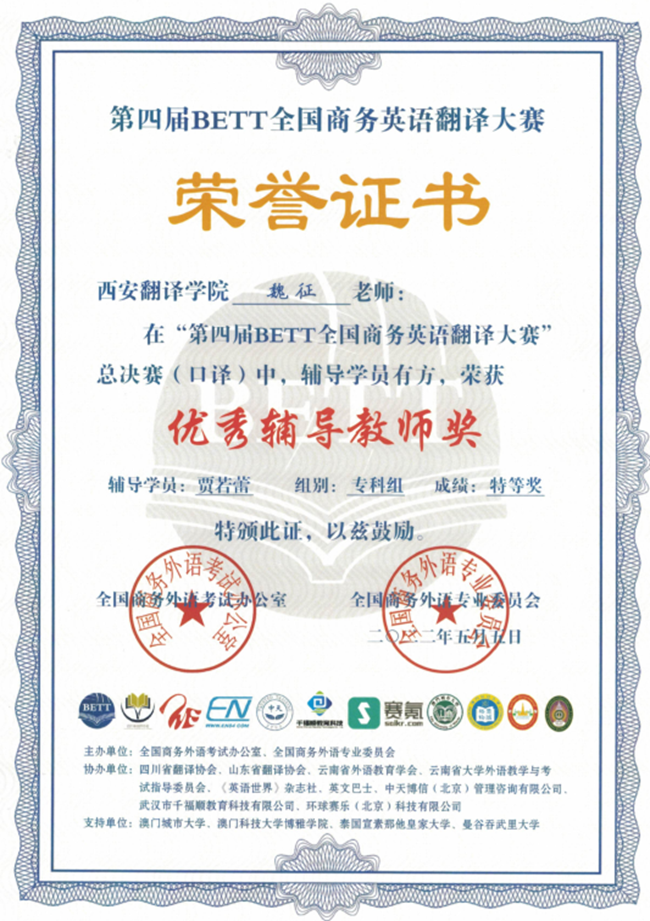 在近日结束的第四届BETT全国商务英语翻译大赛中,西译学子在笔译总决赛和口译总决赛中包揽专科口译组特等奖和一等奖,并获得笔译组专、本科奖项11项。指导老师魏征获得“优秀辅导教师奖”,西安翻译学院获得“最佳组织奖”。