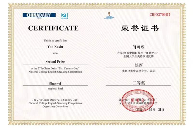 在5月21日结束的第27届中国日报社“21世纪杯”全国大学生英语演讲比赛省级决赛中,我校英文学院2020级英语专业学生闫可欣和2021级学生史碧清分别荣获省赛二等奖、三等奖的优异成绩。这是我校学子在此项赛事中取得的一项突破。