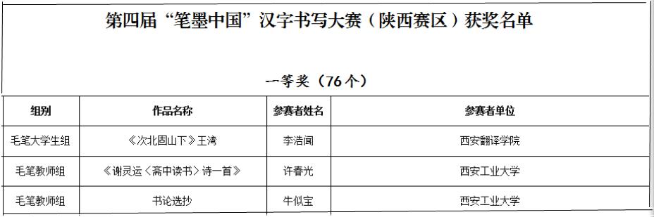 按照《教育部办公厅关于举办第四届中华经典诵写讲大赛的通知》安排,陕西省组织开展了第四届“诵读中国”经典诵读大赛和“笔墨中国”汉字书写大赛两个赛项的省级比赛。我校师生高度重视,认真准备,积极参赛。近日,全国第四届“笔墨中国”汉字书写大赛(陕西赛区)获奖名单公布,我校文学与传媒学院李浩闻同学喜获“笔墨中国”汉字书写大赛毛笔大学生组一等奖。