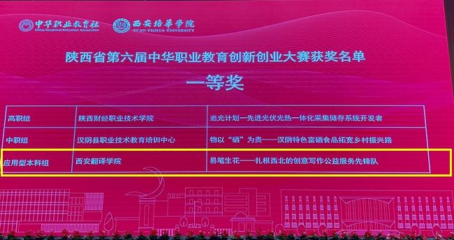 3月14日,由陕西省中华职业教育社主办的陕西省第六届中华职业教育创新创业大赛决赛落幕。我校学子的《易笔生花——扎根西北的创意写作公益服务先锋队》项目荣获应用技术型本科组第一名(一等奖),同时入围国赛;《一臻——沉浸式中华文化体验》项目荣获应用技术型本科组三等奖;我校获评“优秀组织奖”;刷新了我校参加此项赛事以来的最好成绩。