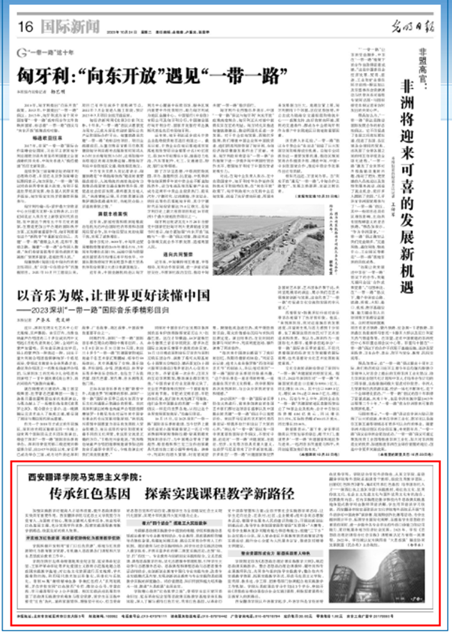 10月24日,光明日报就我校马克思主义学院院长杨学兵撰写的文章《西安翻译学院马克思主义学院:传承红色基因 探索实践课程教学新路径》进行了报道。